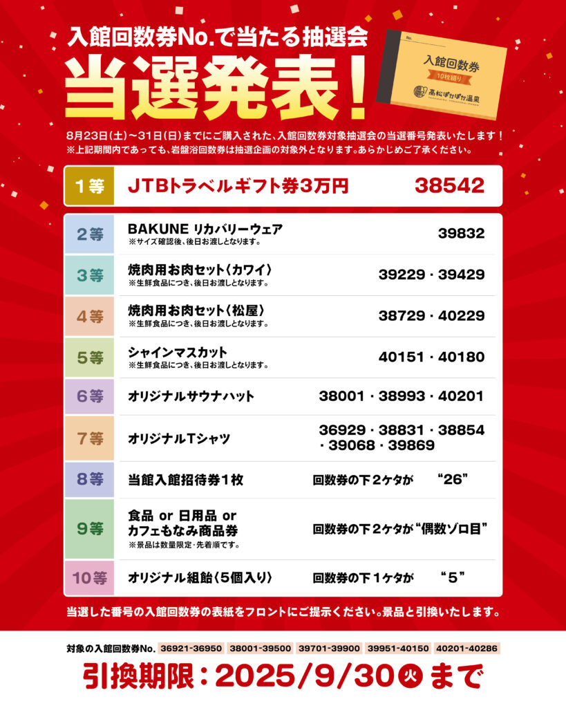 当選した番号の入館回数券の表紙をフロントにご提示ください。景品と引換いたします。