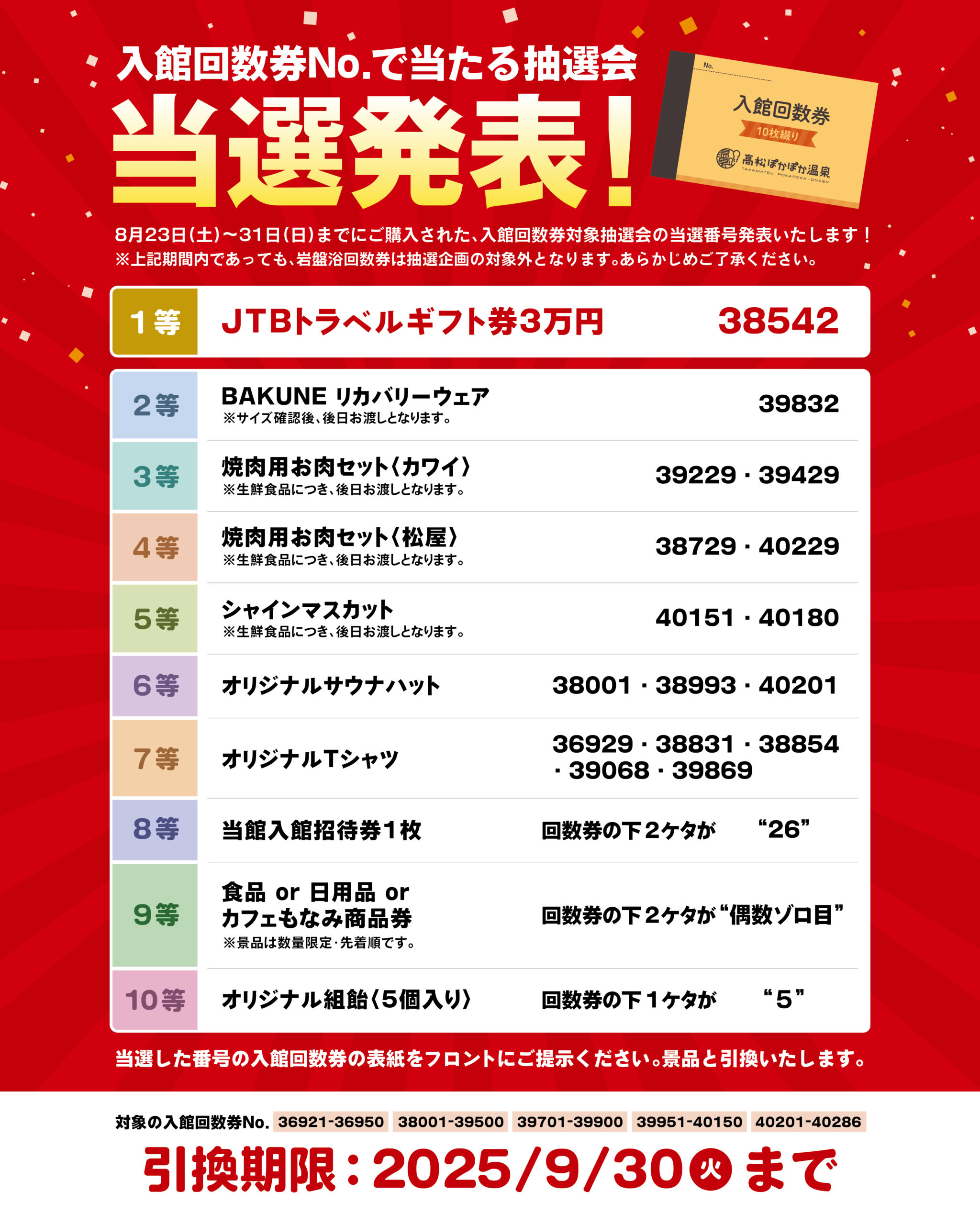 8/23(土)〜31(日)までにご購入された、入館回数券対象抽選会の当選番号を発表いたします!