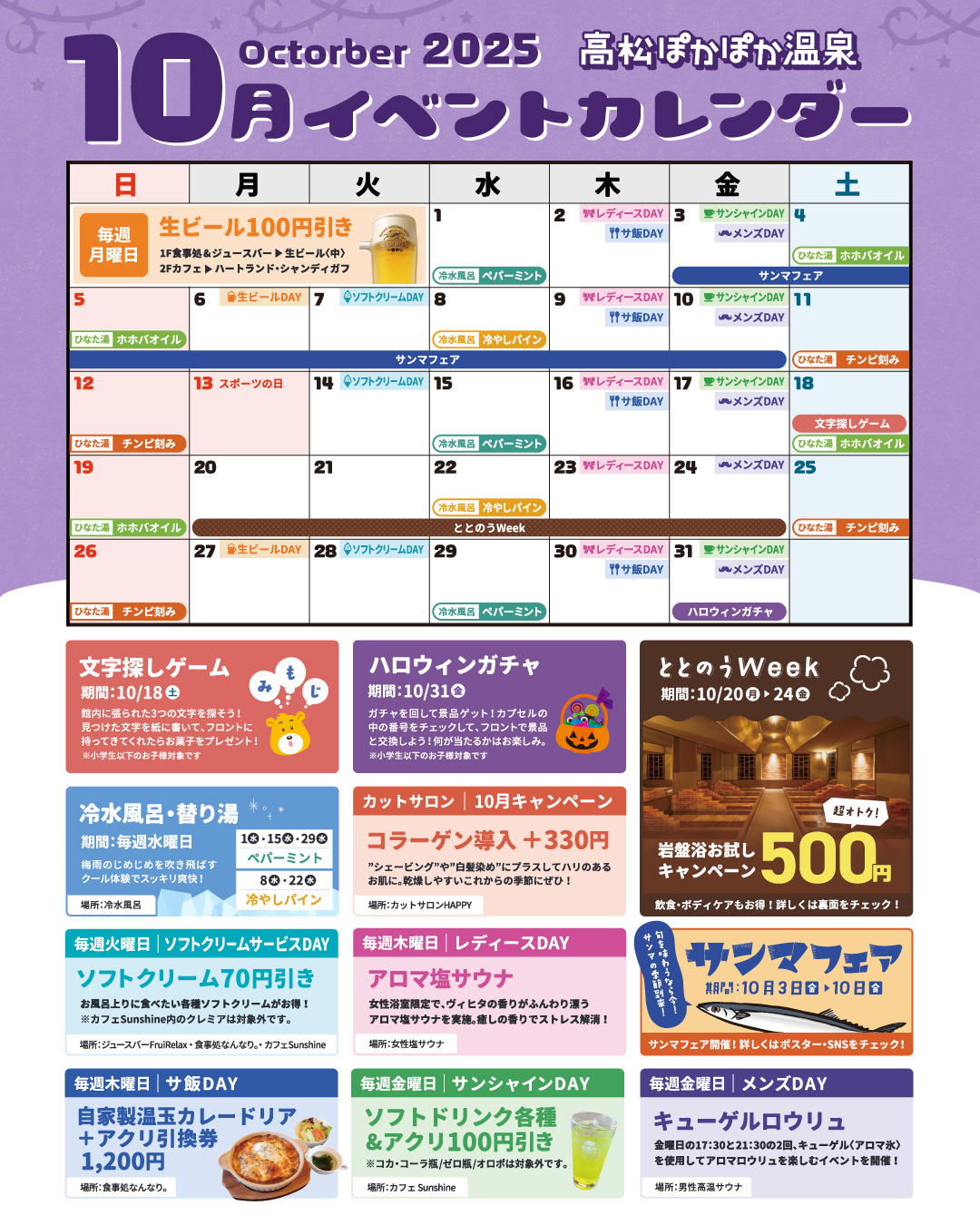 高松ぽかぽか温泉の10月の楽しいイベントカレンダー