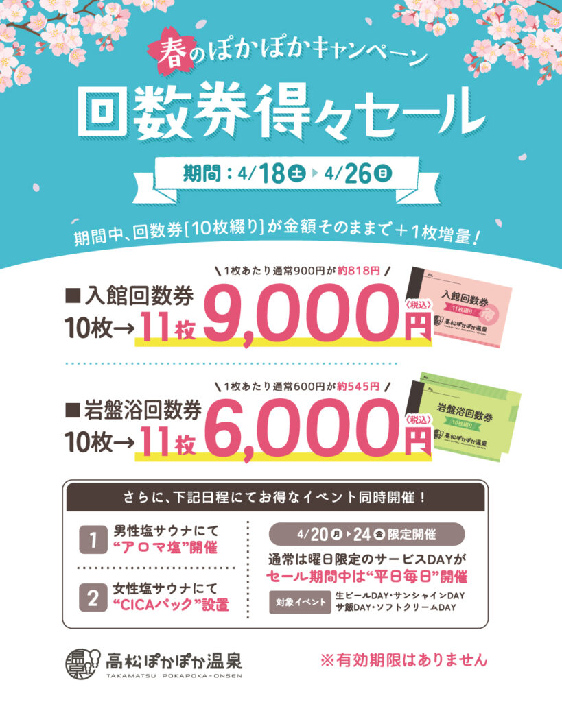 当館では4月18日(土)~26日(日)までの9日間、回数券の得々セールを開催致します。